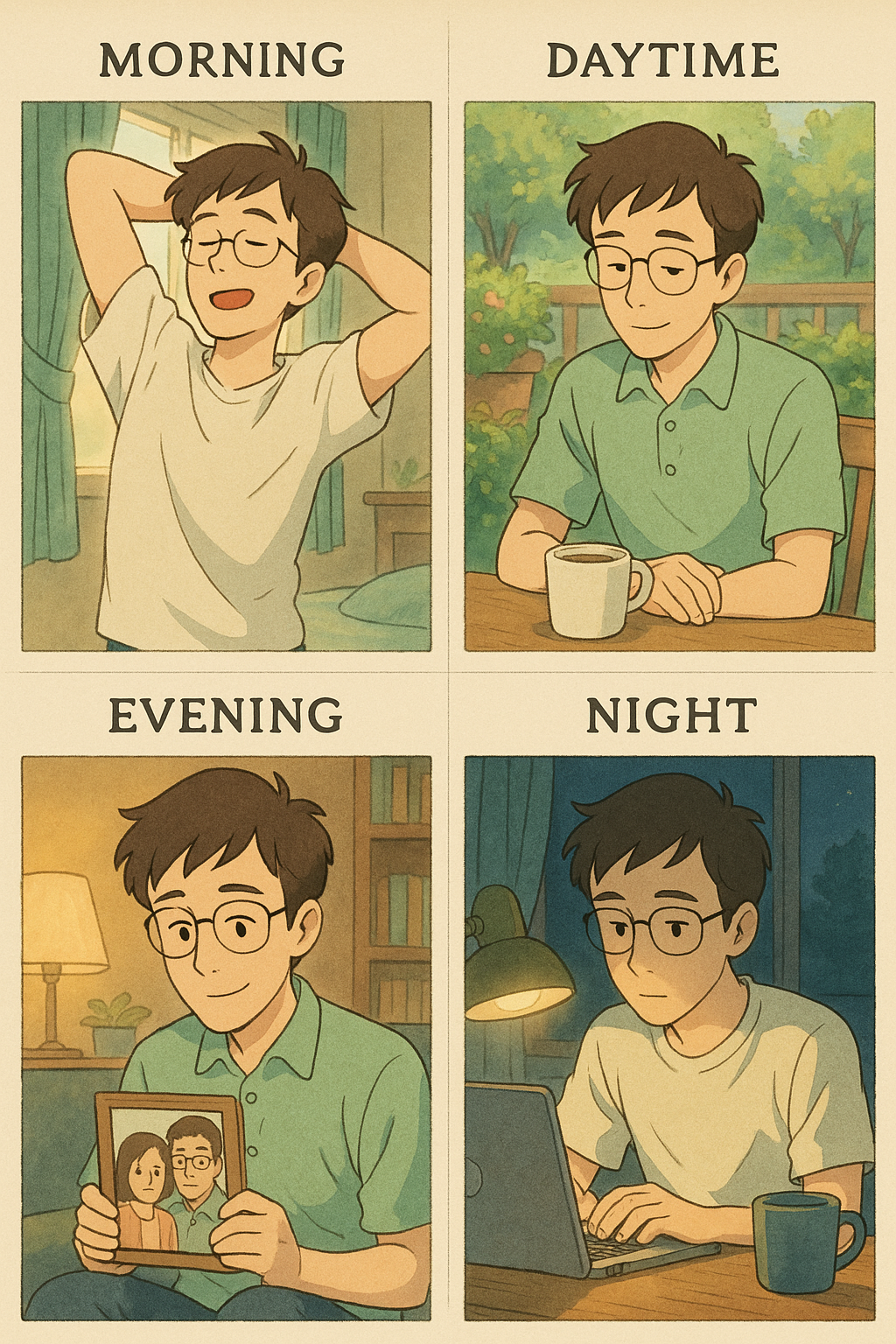 | 저녁 | 따뜻함 → 여운 | 식사, 가족과의 대화, 하루 마무리 | 따뜻한 기타음 + 느린 페이드 컷 + “오늘도 고마워” |