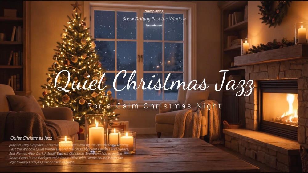 벽난로 앞에서 불꽃을 바라보며 조용히 하루를 정리하는 크리스마스 재즈