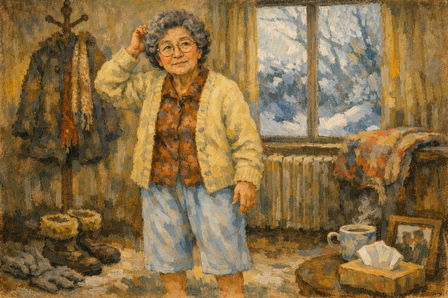 어머니가 여름 바지를 입고 나오신 것입니다.